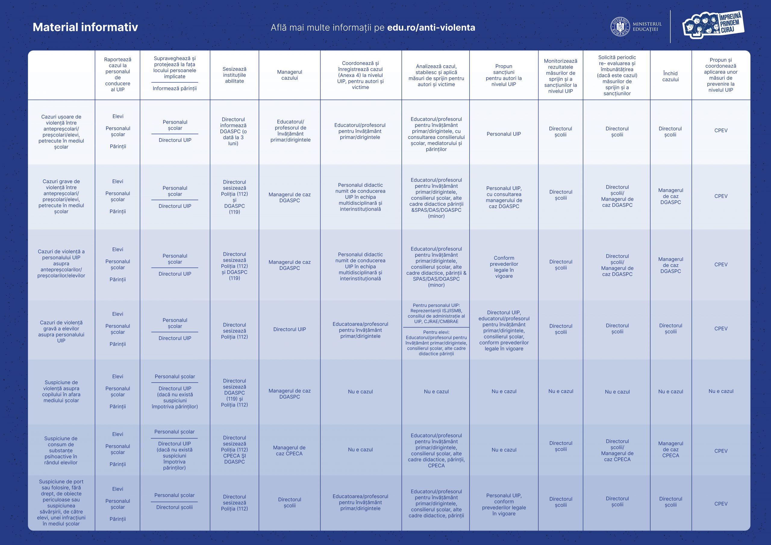Faptele de violență verbală, fizică, psihologică – bullying, emoțională, sexuală, socială, culturală, cibernetică, cât și orice alte activități sau comportamente care pot pune în pericol sănătatea sau integritatea beneficiarilor primari și a personalului din învățământ, sunt gestionate la nivelul unităților de învățământ preuniversitar conform Procedurii privind managementul cazurilor de violență asupra antepreșcolarilor/preșcolarilor/elevilor și a personalului unității de învățământ, precum și al altor situații corelate, în mediul școlar și a suspiciunii de violență asupra copiilor în afara mediului școlar (aprobată prin ordinul de ministru nr. 6.235/2023).